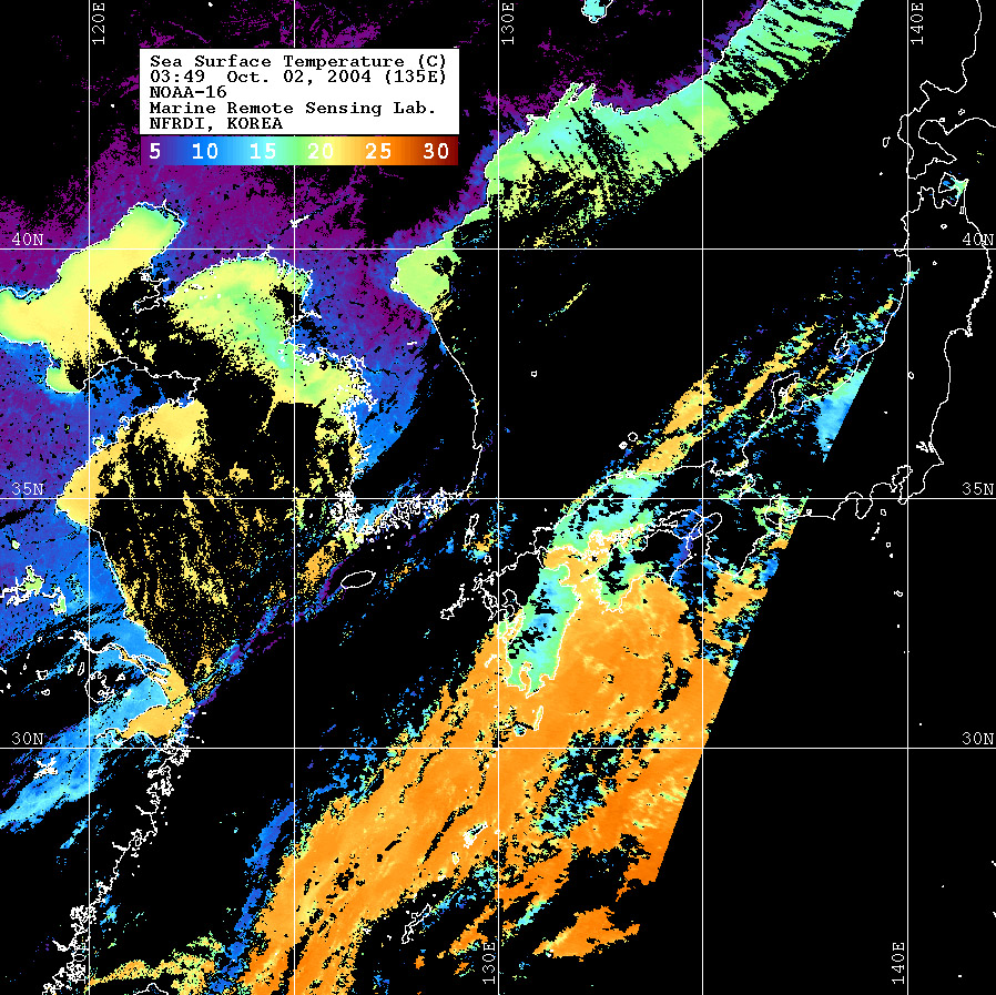 o 2004년 10월 02일 03시 49분 NOAA-16호 위성영상입니다. o 수온분포는 범례를 참고하시기 바랍니다. o 검은색은 구름 또는 육지를 나타냅니다.