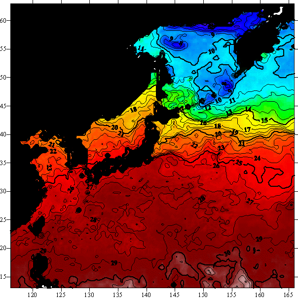 o 2004년 10월 1일 북서태평양 광역해양 수온분포 입니다.