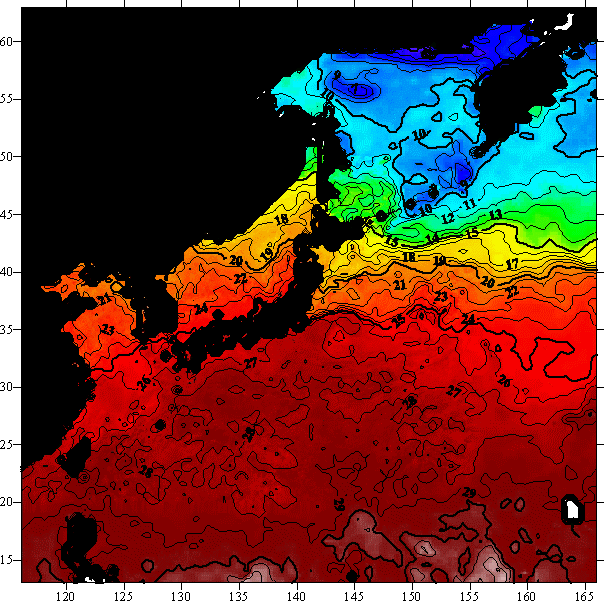 o 2004년 10월 2일 북서태평양 광역해양 수온분포 입니다.