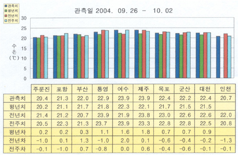 o 금주(2004.09.26∼10.02)의 한반도 연안 표면수온은 동해 연안역에서 섭씨 20.5∼21.5도, 남해 연안역에서 22∼24도, 서해 연안역에서 20.5∼22.5도 내외로 나타납니다.