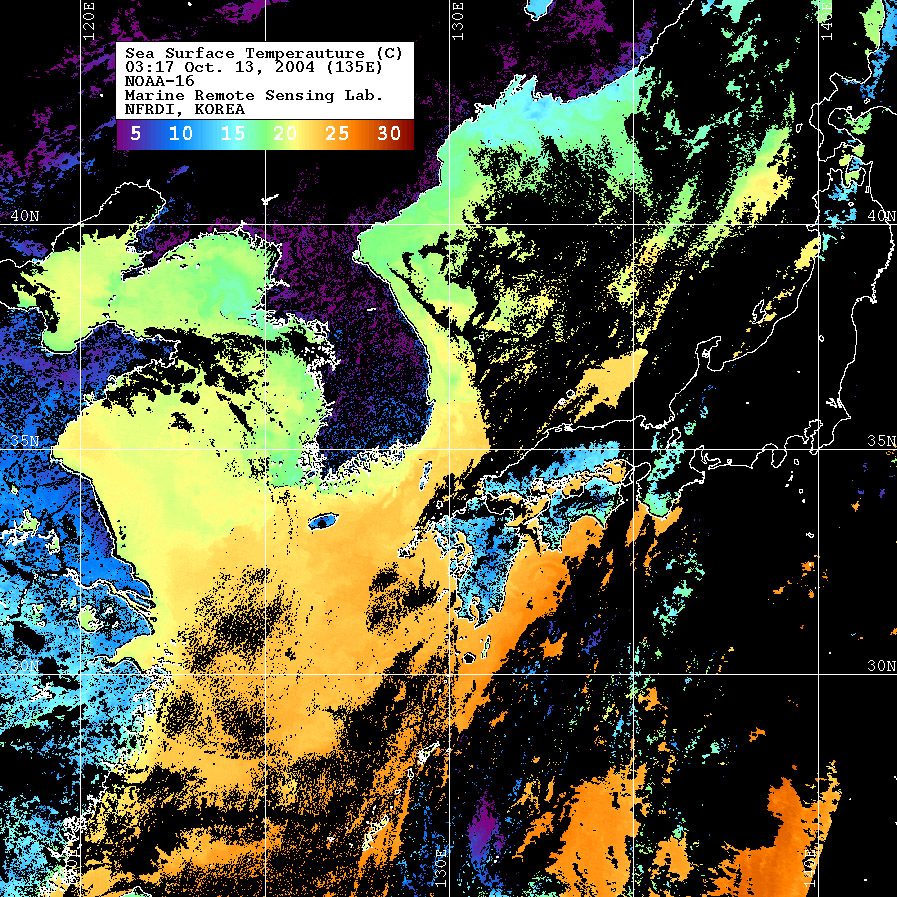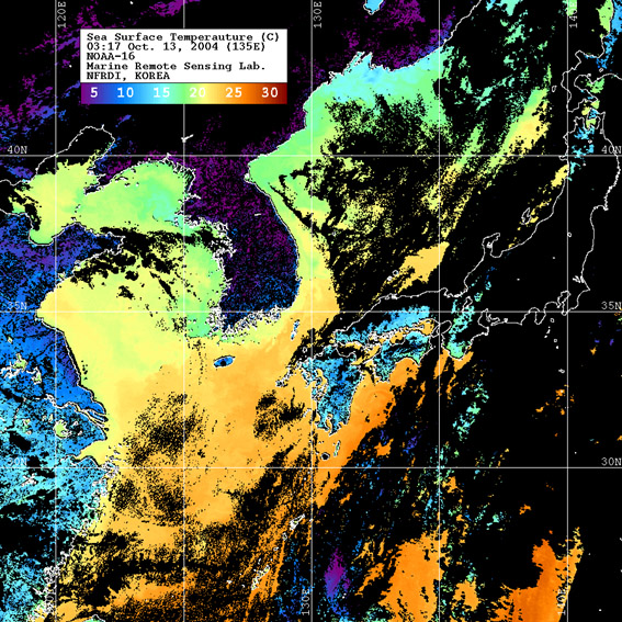 o 2004년 10월 13일 03시 17분 NOAA-16호 위성영상입니다. o 수온분포는 범례를 참고하시기 바랍니다. o 검은색은 구름 또는 육지를 나타냅니다.