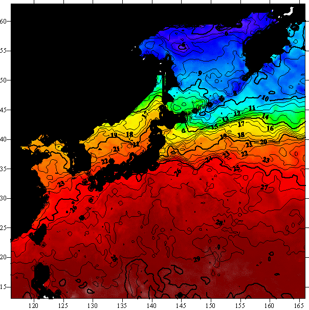 o 2004년 10월 11일 북서태평양 광역해양 수온분포 입니다.