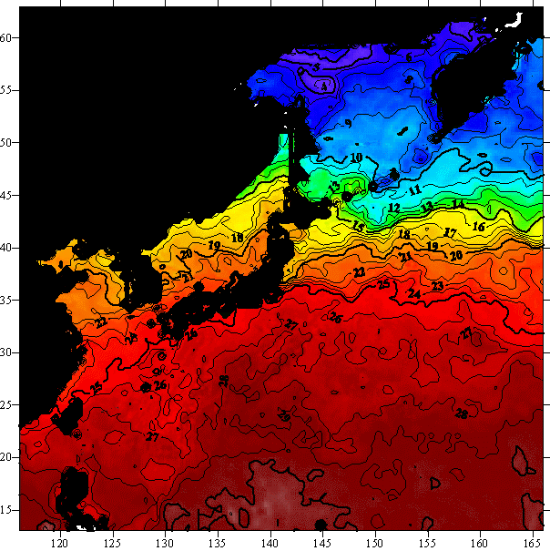 o 2004년 10월 13일 북서태평양 광역해양 수온분포 입니다.