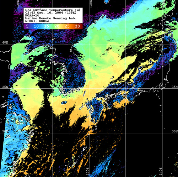 o 2004년 10월 16일 02시 43분 NOAA-16호 위성영상입니다. o 수온분포는 범례를 참고하시기 바랍니다. o 검은색은 구름 또는 육지를 나타냅니다.