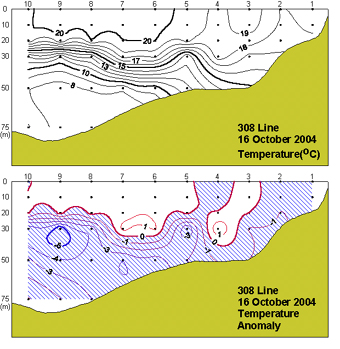 ◦ 2004년 10월 16일 국립수산과학원 서해수산연구소에서 조사한 308선(대천 서방)의 수직수온분포도 및 평년편차도 입니다.