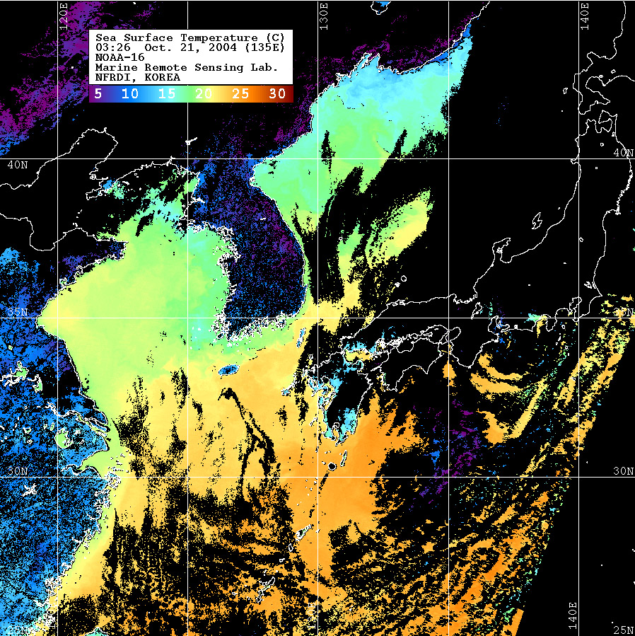 o 2004년 10월 21일 03시 21분 NOAA-16호 위성영상입니다. o 수온분포는 범례를 참고하시기 바랍니다. o 검은색은 구름 또는 육지를 나타냅니다.
