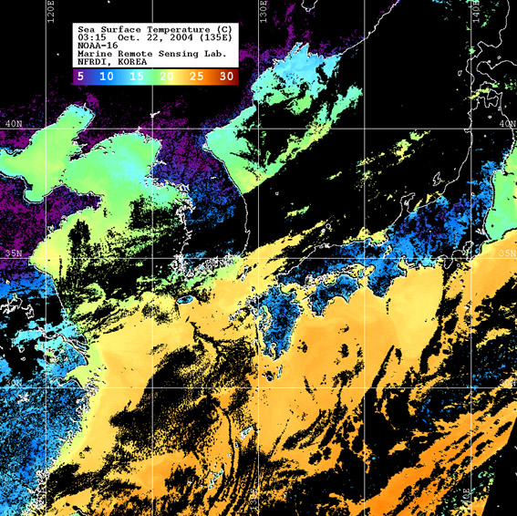 o 2004년 10월 22일 03시 15분 NOAA-16호 위성영상입니다. o 수온분포는 범례를 참고하시기 바랍니다. o 검은색은 구름 또는 육지를 나타냅니다.