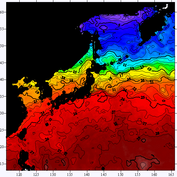 o 2004년 10월 21일 북서태평양 광역해양 수온분포 입니다.