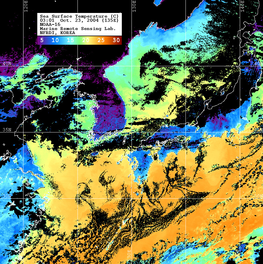 o 2004년 10월 23일 03시 01분 NOAA-16호 위성영상입니다. o 수온분포는 범례를 참고하시기 바랍니다. o 검은색은 구름 또는 육지를 나타냅니다.