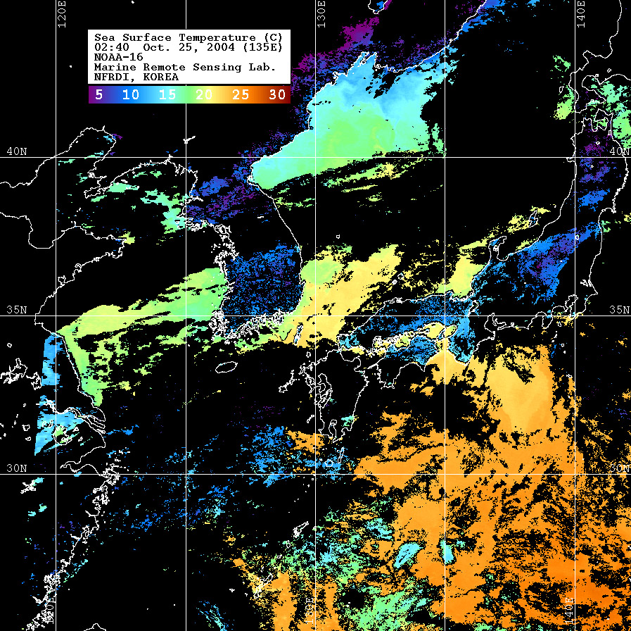 o 2004년 10월 25일 02시 40분 NOAA-16호 위성영상입니다. o 수온분포는 범례를 참고하시기 바랍니다. o 검은색은 구름 또는 육지를 나타냅니다.
