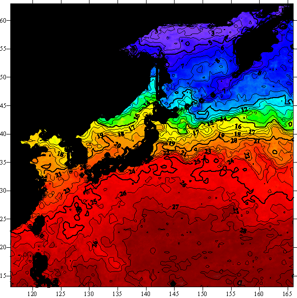 o 2004년 10월 24일 북서태평양 광역해양 수온분포 입니다.