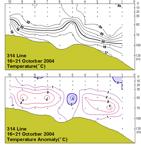 ◦ 2004년 10월 16~21일 국립수산과학원 남해수산연구소에서 조사한 314선(제주 남부해역)의 수직수온분포도 및 평년편차도 입니다.