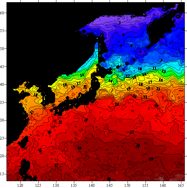 o 2004년 10월 25일 북서태평양 광역해양 수온분포 입니다.