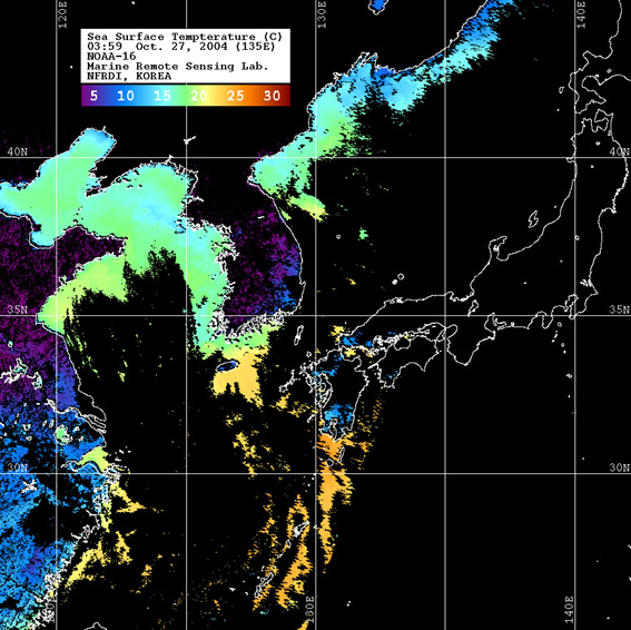 o 2004년 10월 27일 03시 59분 NOAA-16호 위성영상입니다. o 수온분포는 범례를 참고하시기 바랍니다. o 검은색은 구름 또는 육지를 나타냅니다.
