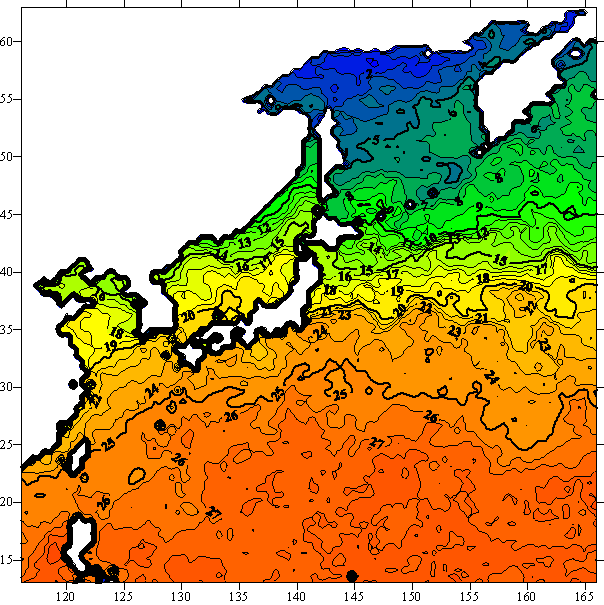 o 2004년 10월 30일 북서태평양 광역해양 수온분포 입니다.