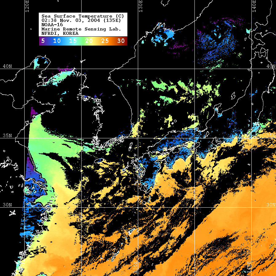 o 2004년 11월 03일 02시 38분 NOAA-16호 위성영상입니다. o 수온분포는 범례를 참고하시기 바랍니다. o 검은색은 구름 또는 육지를 나타냅니다.