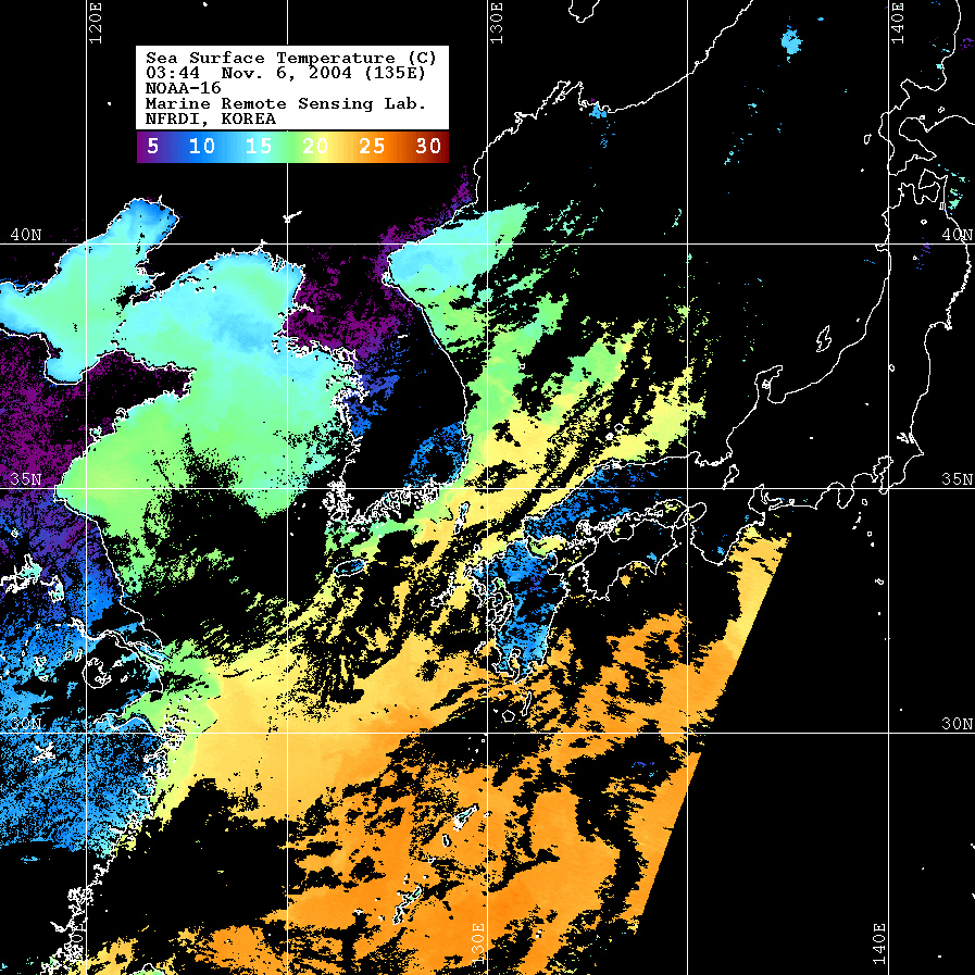 o 2004년 11월 06일 03시 44분 NOAA-16호 위성영상입니다. o 수온분포는 범례를 참고하시기 바랍니다. o 검은색은 구름 또는 육지를 나타냅니다.