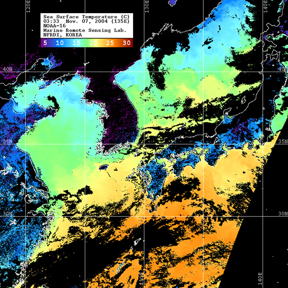 o 2004년 11월 07일 03시 33분 NOAA-16호 위성영상입니다. o 수온분포는 범례를 참고하시기 바랍니다. o 검은색은 구름 또는 육지를 나타냅니다.