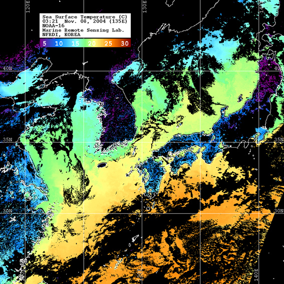 o 2004년 11월 08일 03시 21분 NOAA-16호 위성영상입니다. o 수온분포는 범례를 참고하시기 바랍니다. o 검은색은 구름 또는 육지를 나타냅니다.