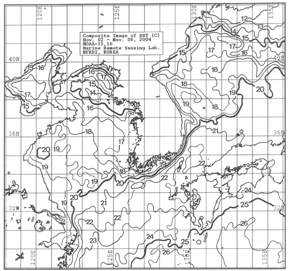 o 금주 (2004.10.31∼11.06)의 한국근해 표면수온은 대화퇴 근해 섭씨 18∼19도, 울릉도 근해 18∼19도, 대마도 근해 21∼22도, 제주도 근해 21∼23도, 이어도 근해 21∼22도, 일향초 근해 19∼20도, 어청도 근해 16∼17도 내외로 나타납니다.