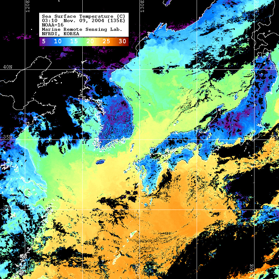 o 2004년 11월 09일 03시 10분 NOAA-16호 위성영상입니다. o 수온분포는 범례를 참고하시기 바랍니다. o 검은색은 구름 또는 육지를 나타냅니다.