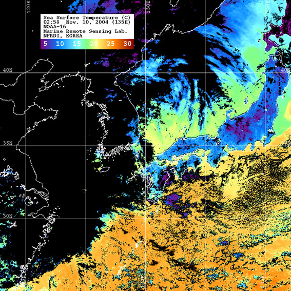o 2004년 11월 10일 02시 58분 NOAA-16호 위성영상입니다. o 수온분포는 범례를 참고하시기 바랍니다. o 검은색은 구름 또는 육지를 나타냅니다.