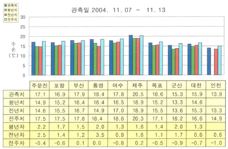 o 금주(2004.11.07∼11.13)의 한반도 연안 표면수온은 동해 연안역에서 섭씨 17도, 남해 연안역에서 18∼20도, 서해 연안역에서 14∼16도 내외로 나타납니다.