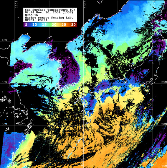 o 2004년 11월 20일 02시 44분 NOAA-16호 위성영상입니다. o 수온분포는 범례를 참고하시기 바랍니다. o 검은색은 구름 또는 육지를 나타냅니다.