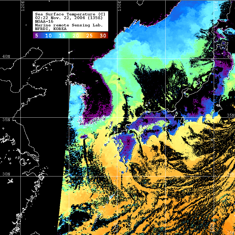 o 2004년 11월 22일 02시 22분 NOAA-16호 위성영상입니다. o 수온분포는 범례를 참고하시기 바랍니다. o 검은색은 구름 또는 육지를 나타냅니다.