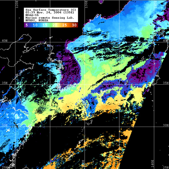 o 2004년 11월 24일 03시 39분 NOAA-16호 위성영상입니다. o 수온분포는 범례를 참고하시기 바랍니다. o 검은색은 구름 또는 육지를 나타냅니다.