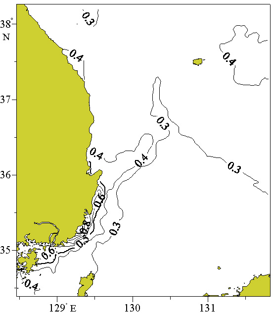 o 근해역 기초먹이 생물량 분포는 0.3~0.4mg/m3 농도로 나타납니다.