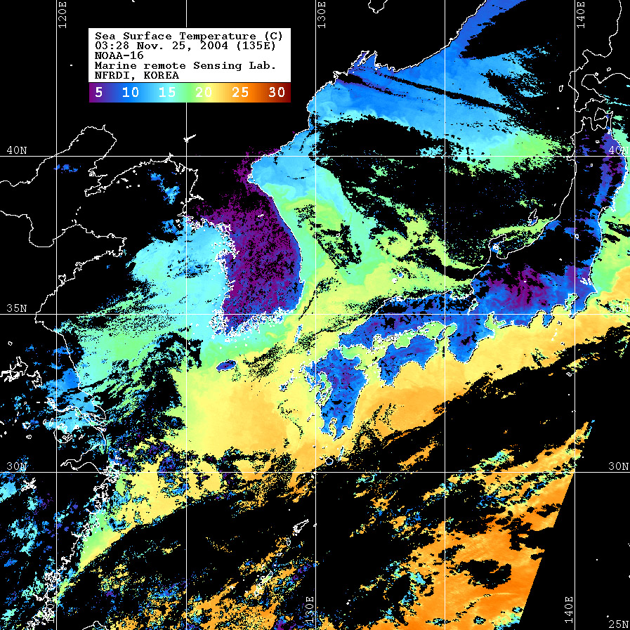 o 2004년 11월 25일 03시 28분 NOAA-16호 위성영상입니다. o 수온분포는 범례를 참고하시기 바랍니다. o 검은색은 구름 또는 육지를 나타냅니다.