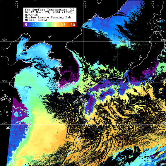 o 2004년 11월 29일 02시 42분 NOAA-16호 위성영상입니다. o 수온분포는 범례를 참고하시기 바랍니다. o 검은색은 구름 또는 육지를 나타냅니다.
