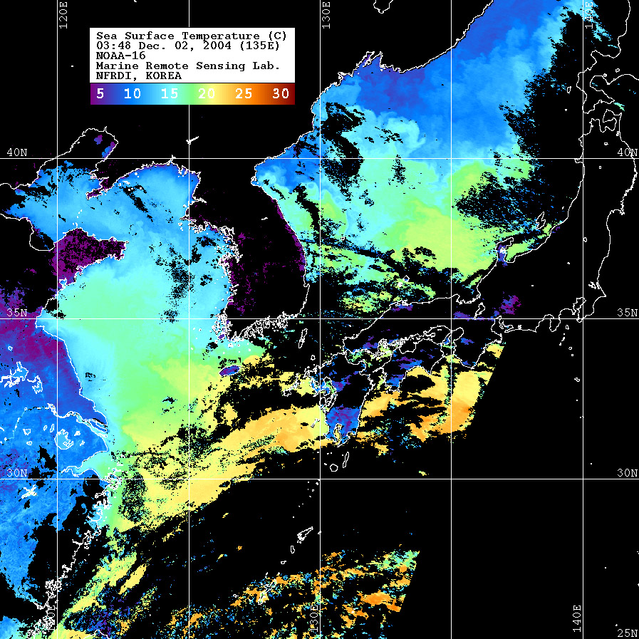 o 2004년 12월 02일 03시 48분 NOAA-16호 위성영상입니다. o 수온분포는 범례를 참고하시기 바랍니다. o 검은색은 구름 또는 육지를 나타냅니다.