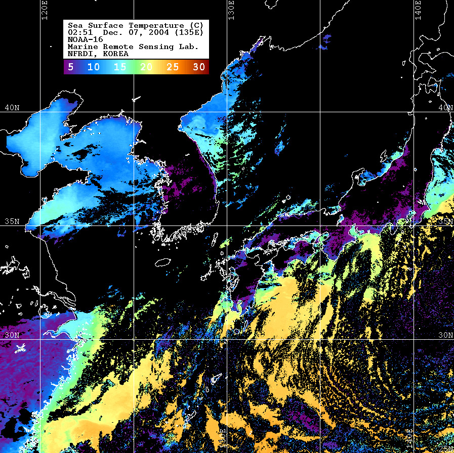 o 2004년 12월 07일 02시 51분 NOAA-16호 위성영상입니다. o 수온분포는 범례를 참고하시기 바랍니다. o 검은색은 구름 또는 육지를 나타냅니다.