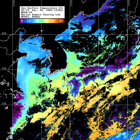 o 2004년 12월 08일 02시 36분 NOAA-16호 위성영상입니다. o 수온분포는 범례를 참고하시기 바랍니다. o 검은색은 구름 또는 육지를 나타냅니다.