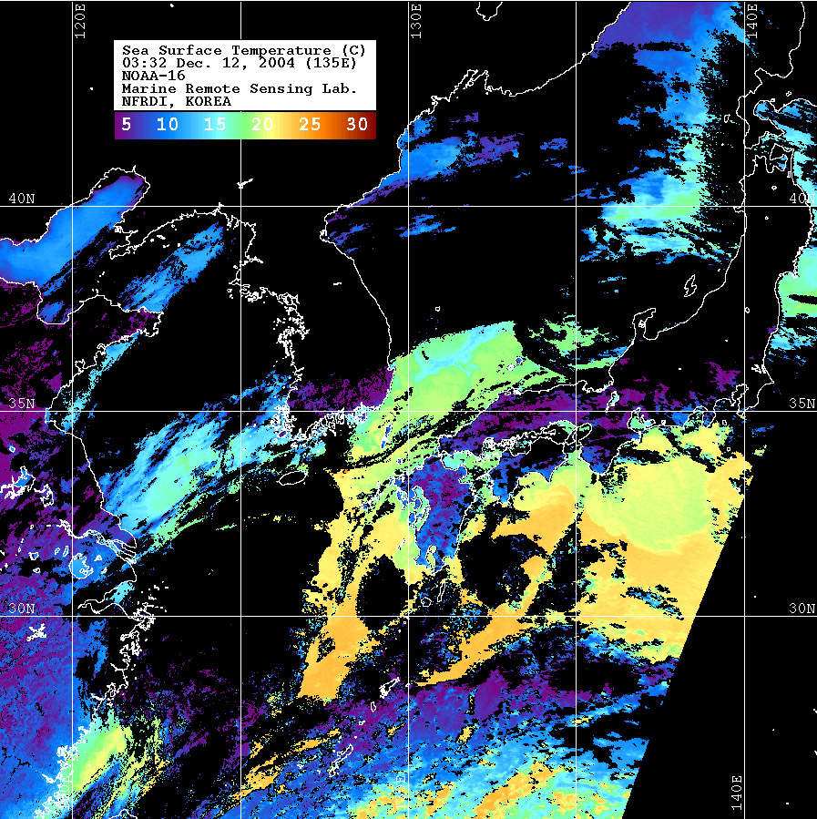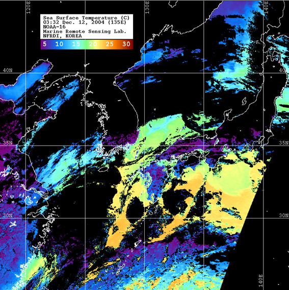 o 2004년 12월 12일 03시 32분 NOAA-16호 위성영상입니다. o 수온분포는 범례를 참고하시기 바랍니다. o 검은색은 구름 또는 육지를 나타냅니다.