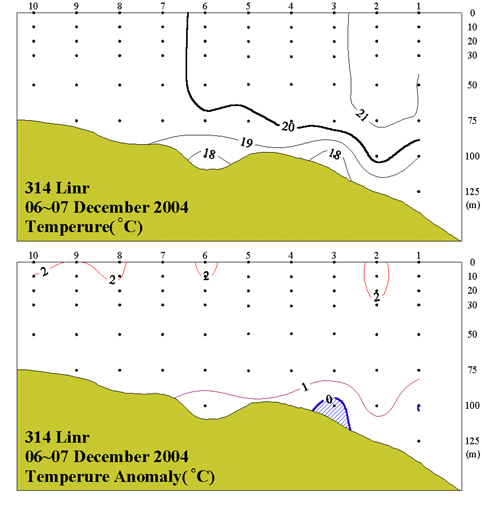 ◦ 2004년 12월 6~7일 국립수산과학원 남해수산연구소에서 조사한 314선(제주 남부해역)의 수직수온분포도 및 평년편차도 입니다.