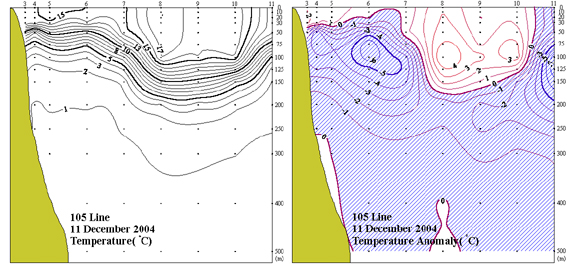 ◦ 2004년 12월 11일 국립수산과학원 동해수산연구소에서 조사한 105선(동해 동방)의 수직수온분포도 및 평년편차도입니다.