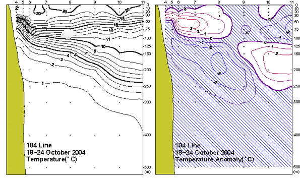 ◦ 2004년 12월 12일 국립수산과학원 동해수산연구소에서 조사한 104선(죽변 동방)의 수직수온분포도 및 평년편차도 입니다.