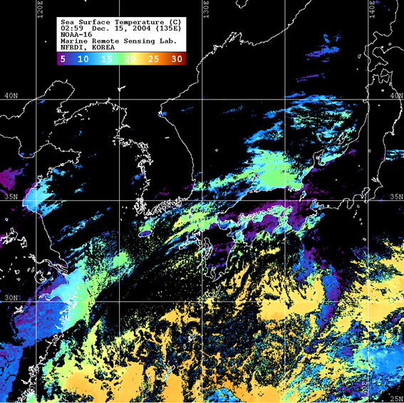 o 2004년 12월 15일 02시 59분 NOAA-16호 위성영상입니다. o 수온분포는 범례를 참고하시기 바랍니다. o 검은색은 구름 또는 육지를 나타냅니다.