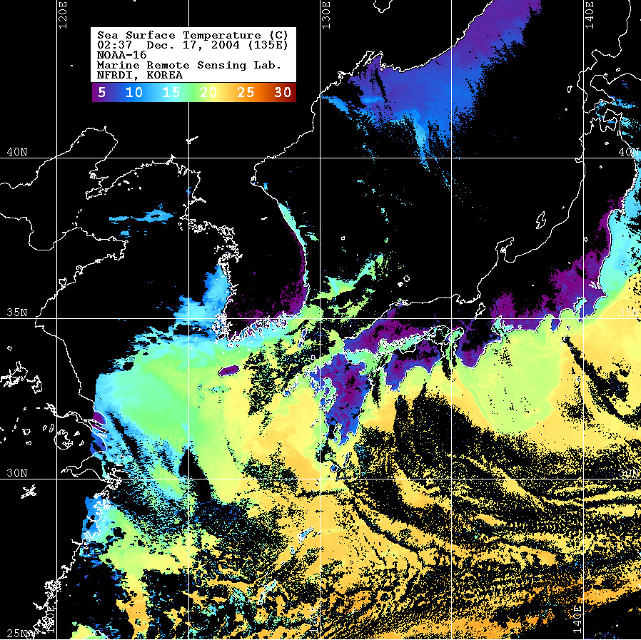 o 2004년 12월 17일 02시 37분 NOAA-16호 위성영상입니다. o 수온분포는 범례를 참고하시기 바랍니다. o 검은색은 구름 또는 육지를 나타냅니다.