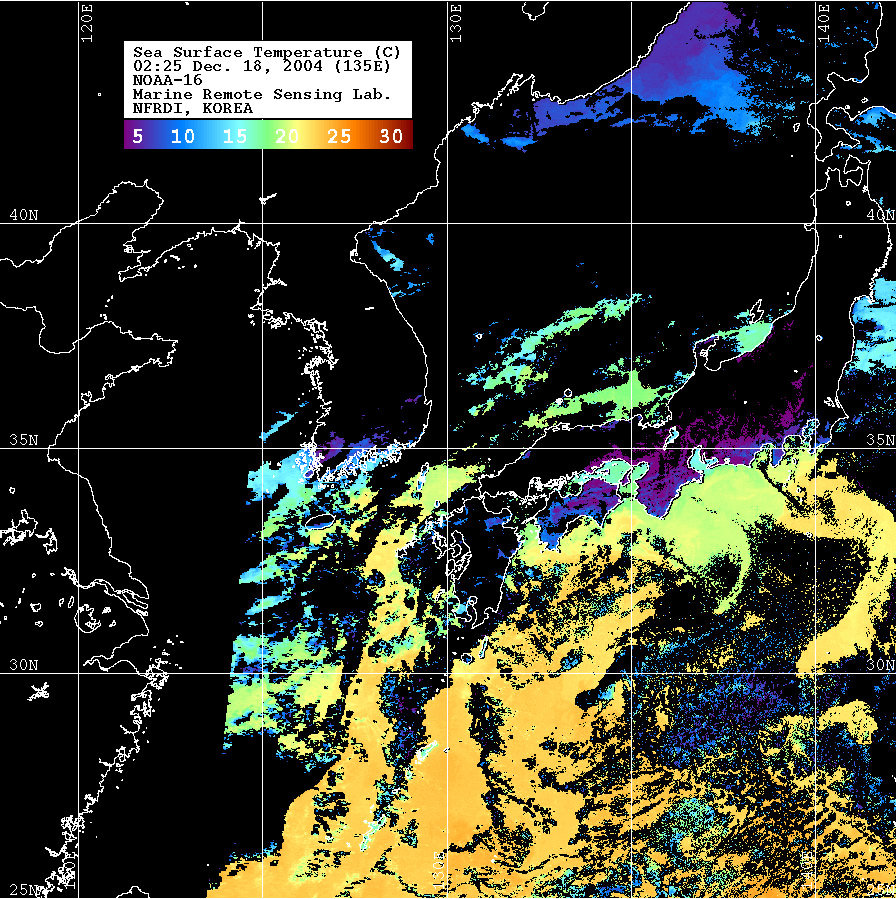 o 2004년 12월 18일 02시 25분 NOAA-16호 위성영상입니다. o 수온분포는 범례를 참고하시기 바랍니다. o 검은색은 구름 또는 육지를 나타냅니다.