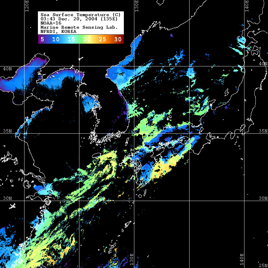 o 2004년 12월 20일 03시 43분 NOAA-16호 위성영상입니다. o 수온분포는 범례를 참고하시기 바랍니다. o 검은색은 구름 또는 육지를 나타냅니다.