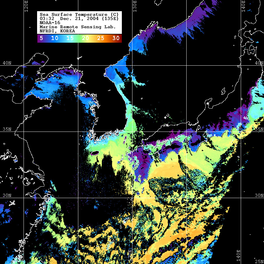 o 2004년 12월 21일 03시 32분 NOAA-16호 위성영상입니다. o 수온분포는 범례를 참고하시기 바랍니다. o 검은색은 구름 또는 육지를 나타냅니다.