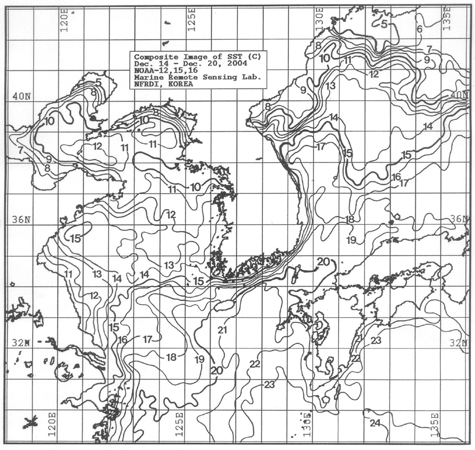 o 금주 (2004.12.14∼12.20)의 한국근해 표면수온은 대화퇴 근해 섭씨 13∼14도, 울릉도 근해 16∼17도, 대마도 근해 19∼20도, 제주도 근해 19∼20도, 이어도 근해 17∼18도, 일향초 근해 14∼15도, 어청도 근해 11∼12도 내외로 나타납니다.