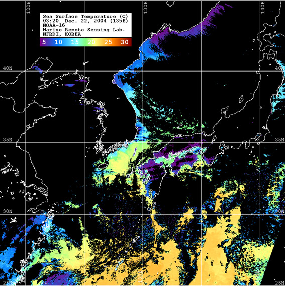 o 2004년 12월 23일 03시 08분 NOAA-16호 위성영상입니다. o 수온분포는 범례를 참고하시기 바랍니다. o 검은색은 구름 또는 육지를 나타냅니다.