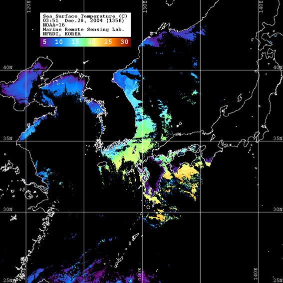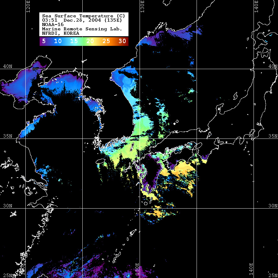 o 2004년 12월 28일 03시 51분 NOAA-16호 위성영상입니다. o 수온분포는 범례를 참고하시기 바랍니다. o 검은색은 구름 또는 육지를 나타냅니다.