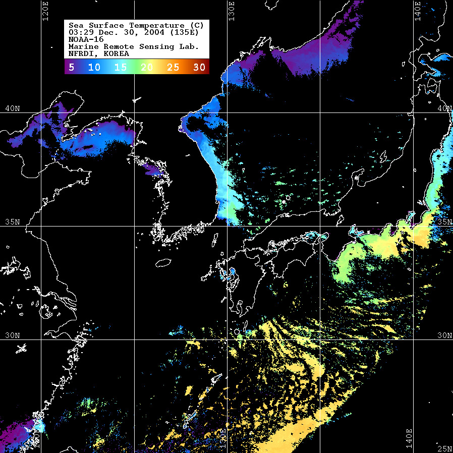 o 2004년 12월 30일 03시 29분 NOAA-16호 위성영상입니다. o 수온분포는 범례를 참고하시기 바랍니다. o 검은색은 구름 또는 육지를 나타냅니다.