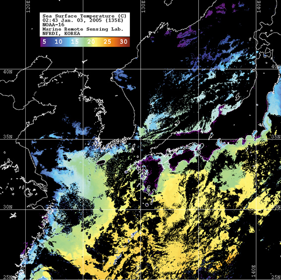 o 2005년 01월 03일 02시 43분 NOAA-16호 위성영상입니다. o 수온분포는 범례를 참고하시기 바랍니다. o 검은색은 구름 또는 육지를 나타냅니다.